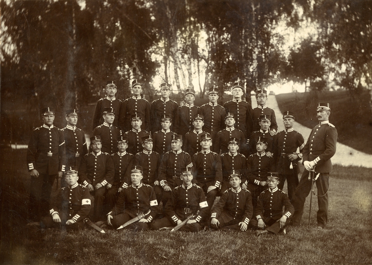 Titel: Grupporträtt av soldater och sjukvårdare vid Svea livgarde I 1.