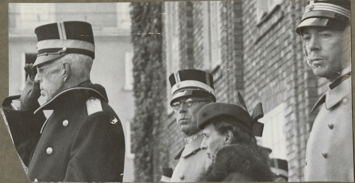 Kungligt besök i samband med paradering av Göta livgarde I 2; Gustav V, Gustav VI Adolf och arvprins Gustav Adolf tillsammans med Louise Mountbatten.