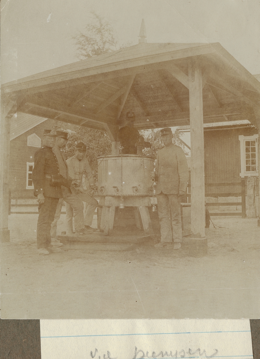 En grupp soldater samlade kring en vattenbrunn. Bakom syns byggnader som tillhör Hälsinge regementes kaserngård i Mohed.