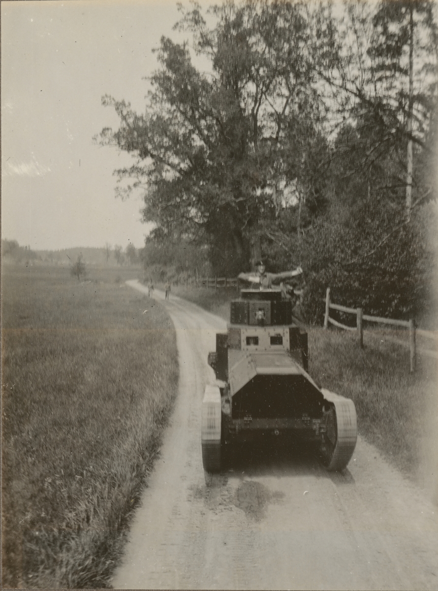Titel: Fältövning med stridsvagn m/1921 (eller m/1921-1929). Göta livgardes stridsvagnsbataljon år 1929.