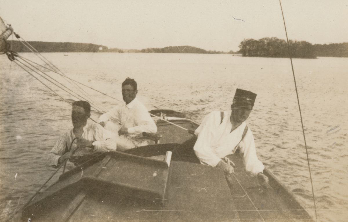 Titel: Tre män i segelbåt. I bakgrunden syns en holme och strandlinje.