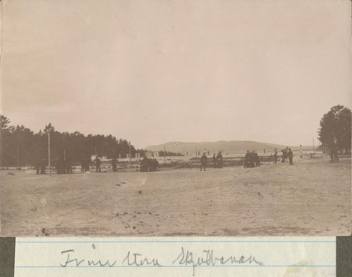Titel: Översiktbild av en pågående skjutövning tagen på Hälsinge regementets övningsplats Mohed.