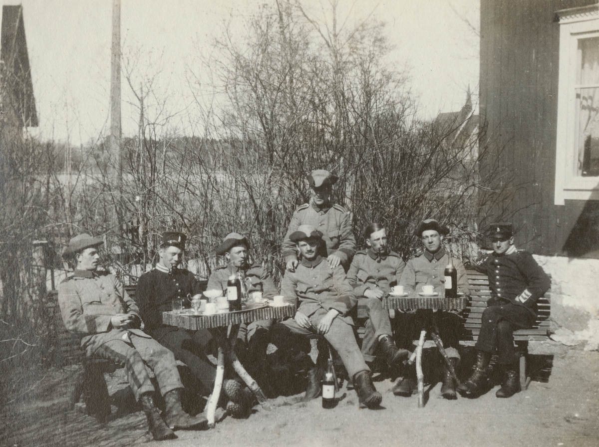 Titel: Gruppbild av soldater från Göta livgarde I 2 på en uteservering.