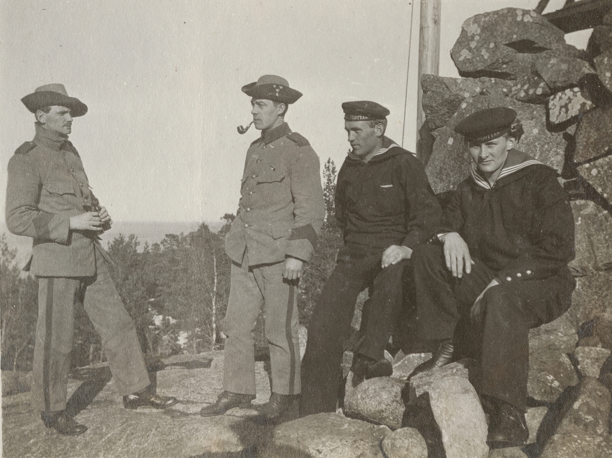 Titel: Soldater från Göta livgarde I 2 och från flottan vid en vaktpost på berget.