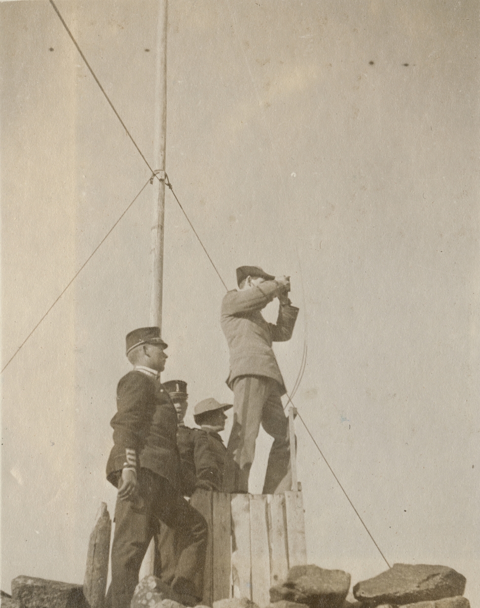 Titel: En bevakningsplats på berget. Fyra soldater vid en mast håller uppsikt över omgivningen.