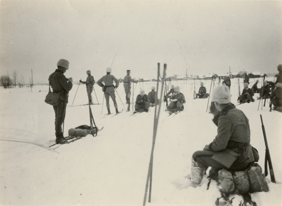 Titel: Text i fotoalbum: "Vinterövningarna vid Umeå 1916. På väg till Sörfors. Skolchefen inspekterar!"