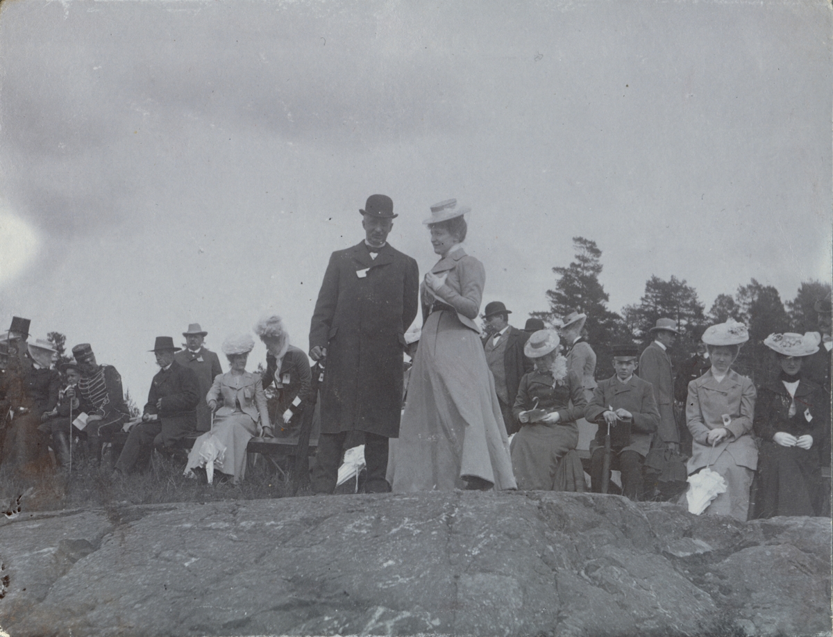 Titel: Text i fotoalbum: "Ränneslätt K 4 Kav. aspirantskola 1900". Samling av civila vid övningsplats.