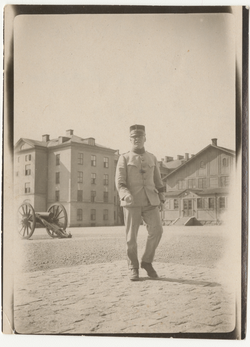 Hugo Strandberg, officer vid Norrbottens regemente I 19, på kaserngården vid Vaxolms grenadjärregemente.