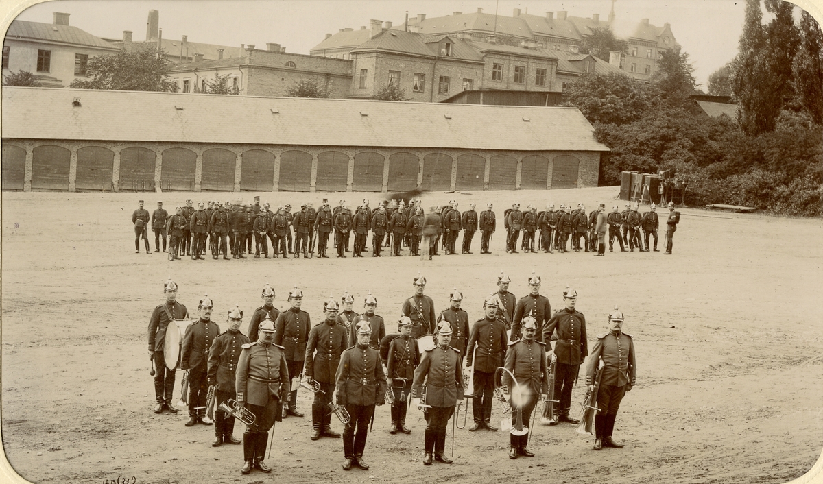 Högvakt ur Svea ingenjörkår Ing 1 med musikkår uppställd vid Jaktvarvsgränd.