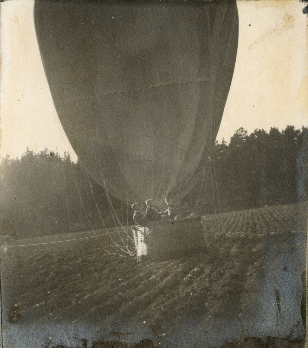 Titel: Tre män i luftballong som landat på åker.