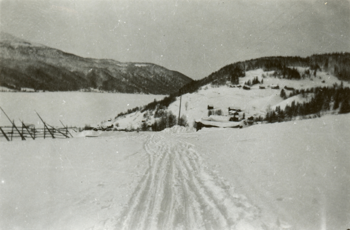Titel: Text i fotoalbum: "Vinterövningar med plogkolonn - Björnänge febr 1930. Utsikt från Palms gård- norrut".