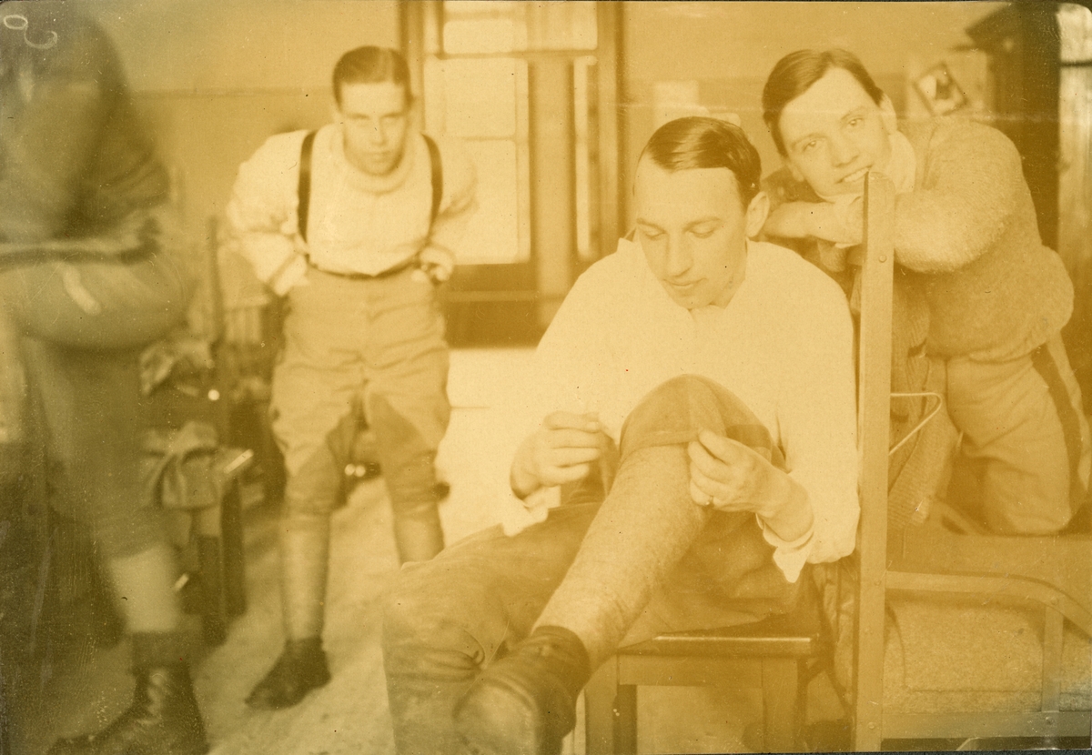 Text i fotoalbum: "Underofficersskolan 1911-1912 Umeå-Eksjö. Individens benbeväpning: 2 par kalsong, Aschans strumpben, 2 par strumpor, 1 par raggsockor".