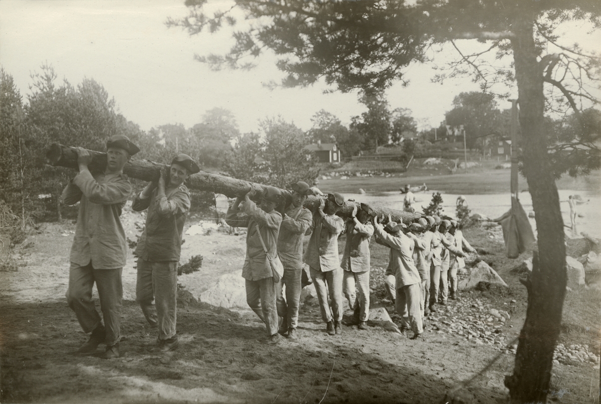 Titel: Elever från Krigsskolan Karlberg förbereder brobygge över vattendrag.