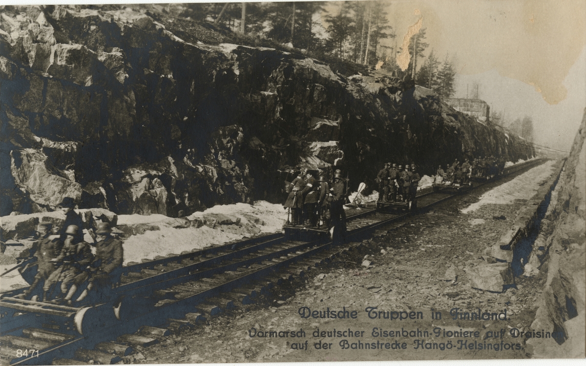 Text i fotoalbum: "Tyska trupper i Finland. Tyska järnvägspionjärers frammarsch på järnvägslinjen Hangö-Helsingfors".