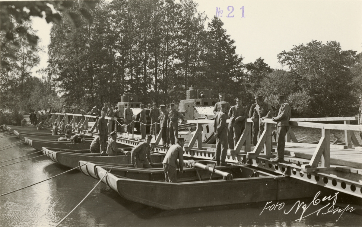 Text i fotoalbum: "Tung krigsbro vid Vestanå juli 1935".