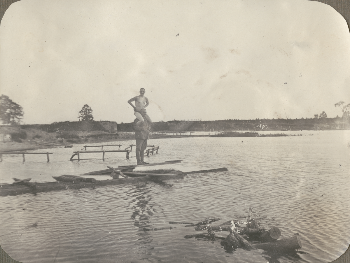 Text i fotoalbum: "Sommaren 1916. Vid öfversvämning badas bakom skyttegrafven, tills några ryska skrappnells gör slut på nöjet."