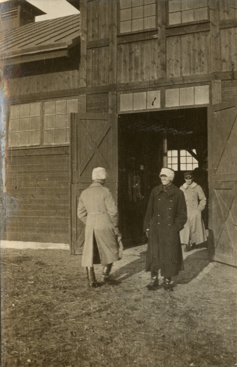Titel: Text i fotoalbum: "Soldater framför en byggnad".