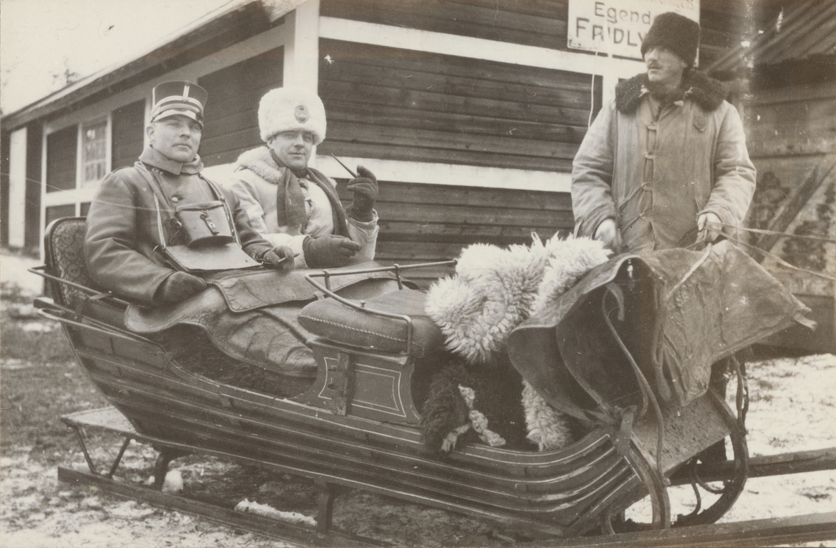 Titel: Två män sitter i en släde med kusken stånde brevid. Bakom släden syns en större träbyggnad.