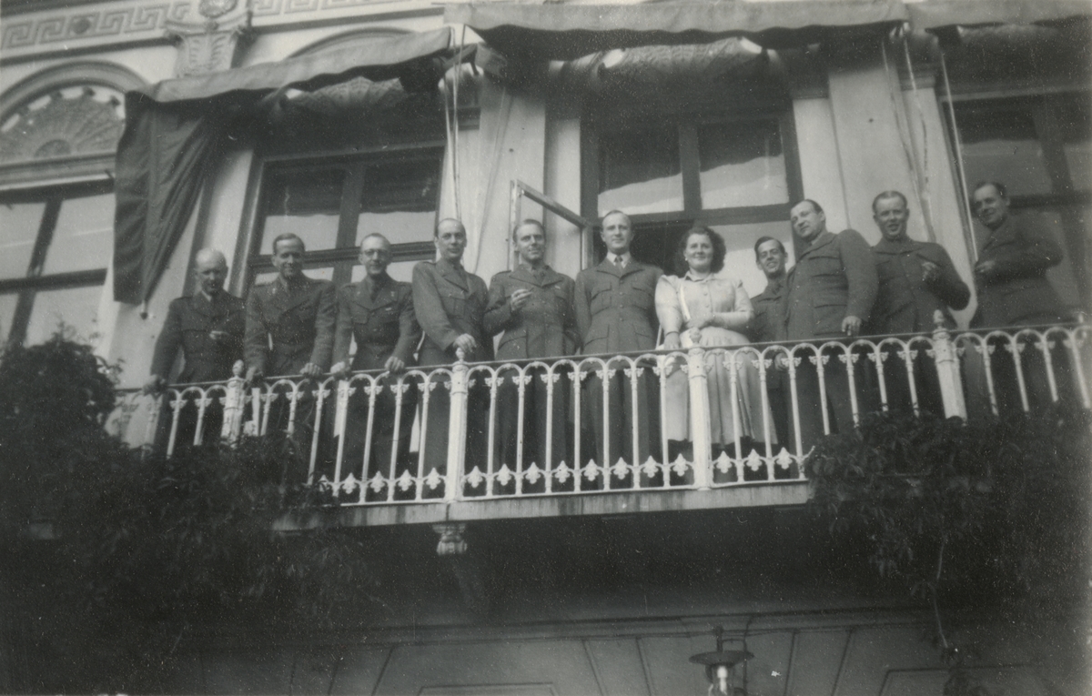 Titel: Text i fotoalbum: "Intfältövningar i Gysinge våren 1947". Gruppbild på balkong.