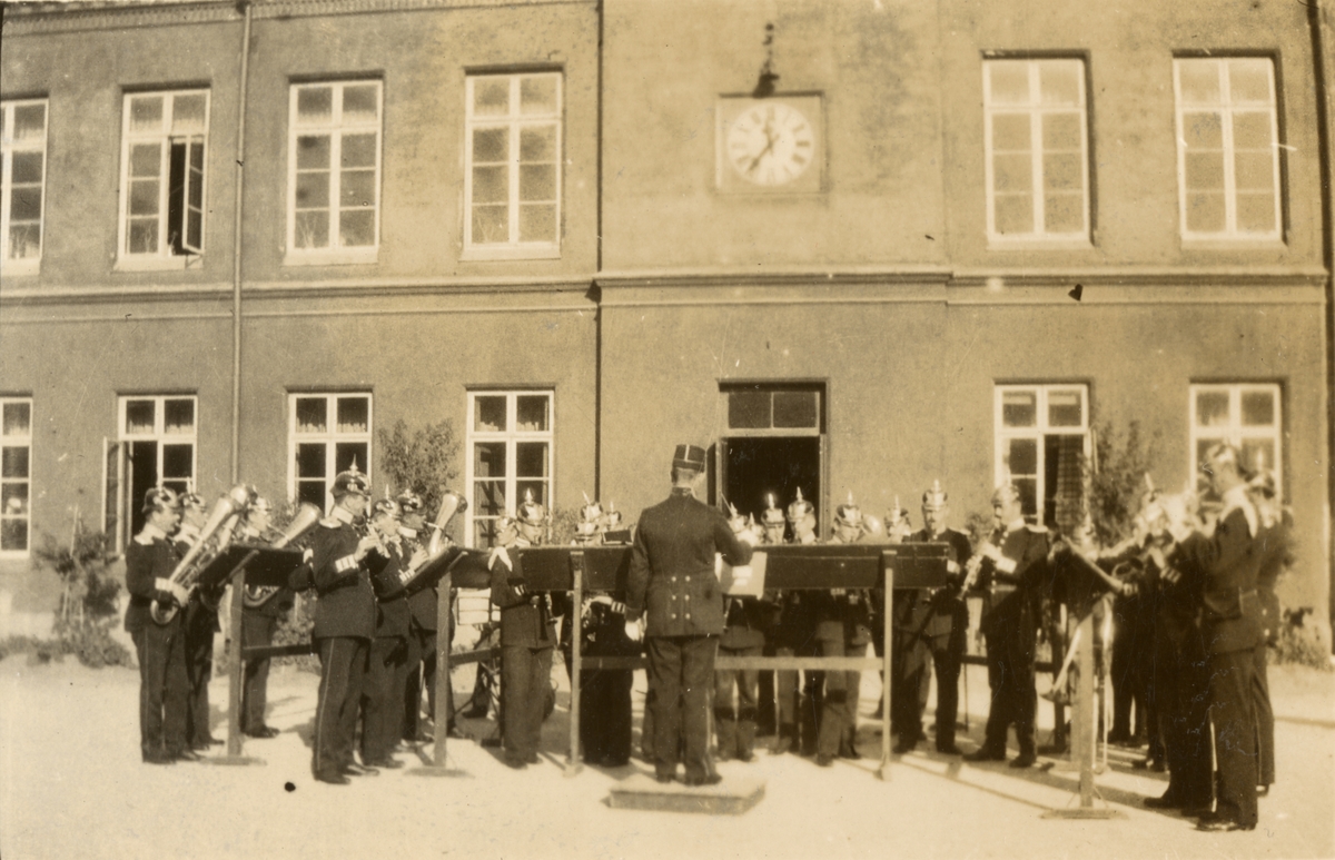 Göta livgardes musikkår ger konsert på kaserngården på Linnégatan, matsal och skolbyggnaden i bakgrunden.
