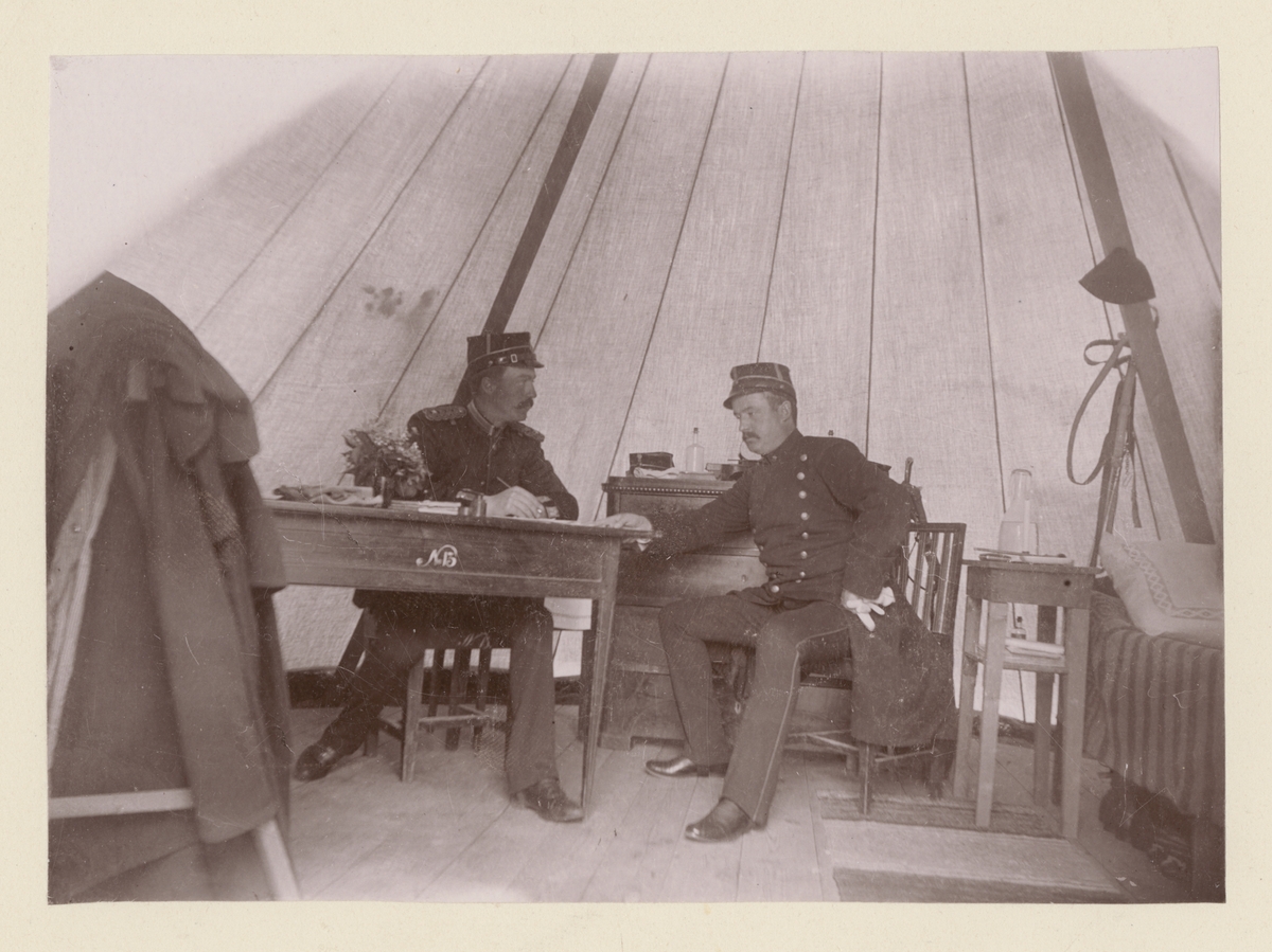 Titel: Löjtnanterna Henning Sandelin och Carl Richard Reinhold Sandberg i tält på Mohed.