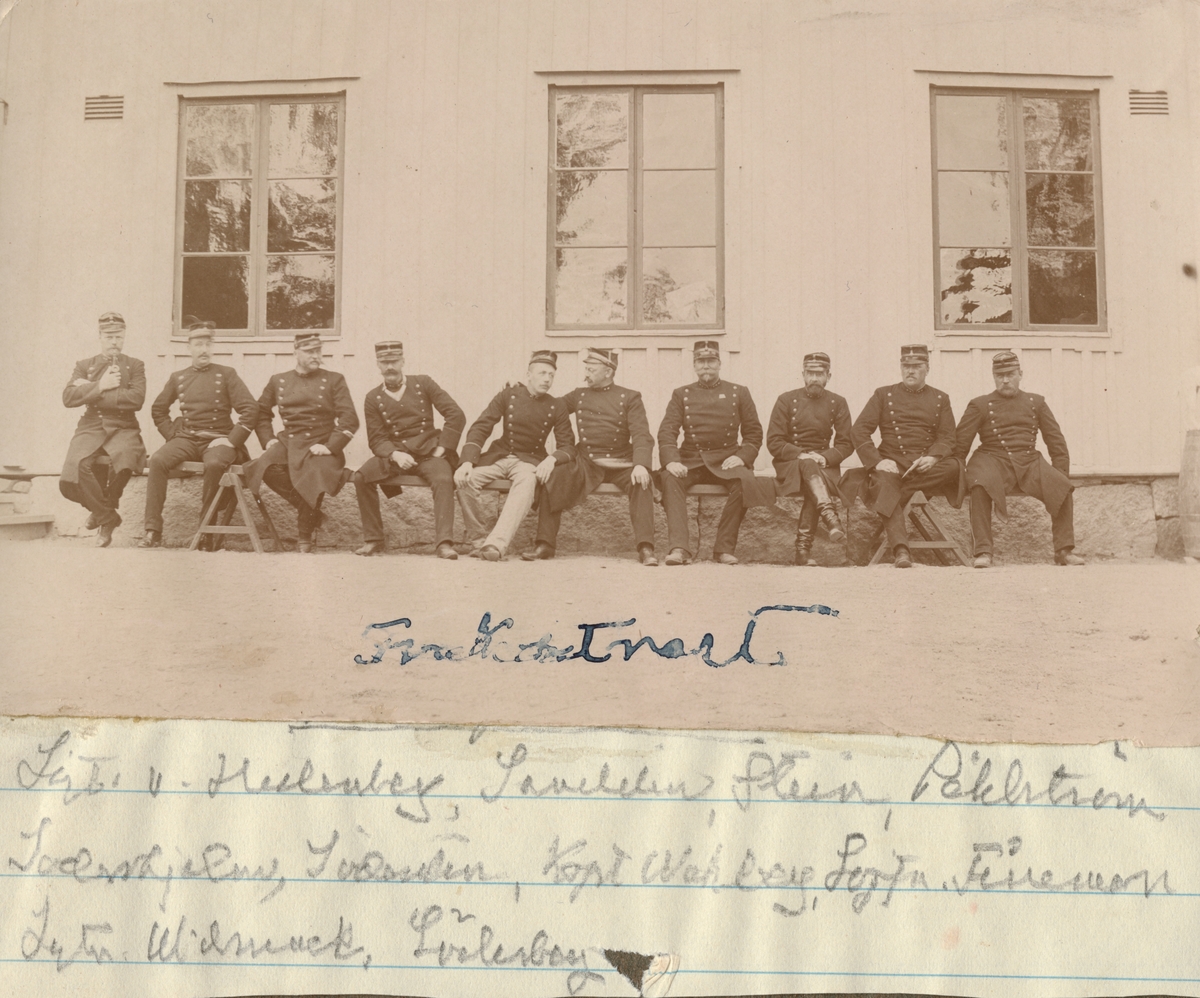 En gruppbild med officerare från Hälsinge regemente sittandes på en bänk framför en byggnad. Enligt bildtexten är följande personerna med i bilden: löjtnant von Hedenberg, löjtnant Sandelin, löjtnant Stein, underlöjtnant Pihlström, kapten Söderhjelm, löjtnant Södersten, kapten Wahlberg, löjtnant Fineman, löjtnant Widmark och löjtnant Söderberg.