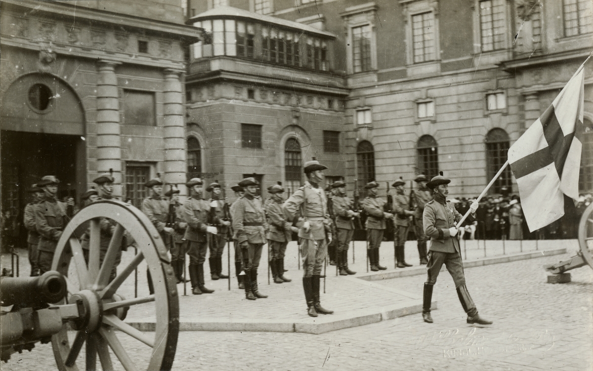 Titel: Text i fotoalbum: Parad för fanan. Kungl. Positionsartillerireg.