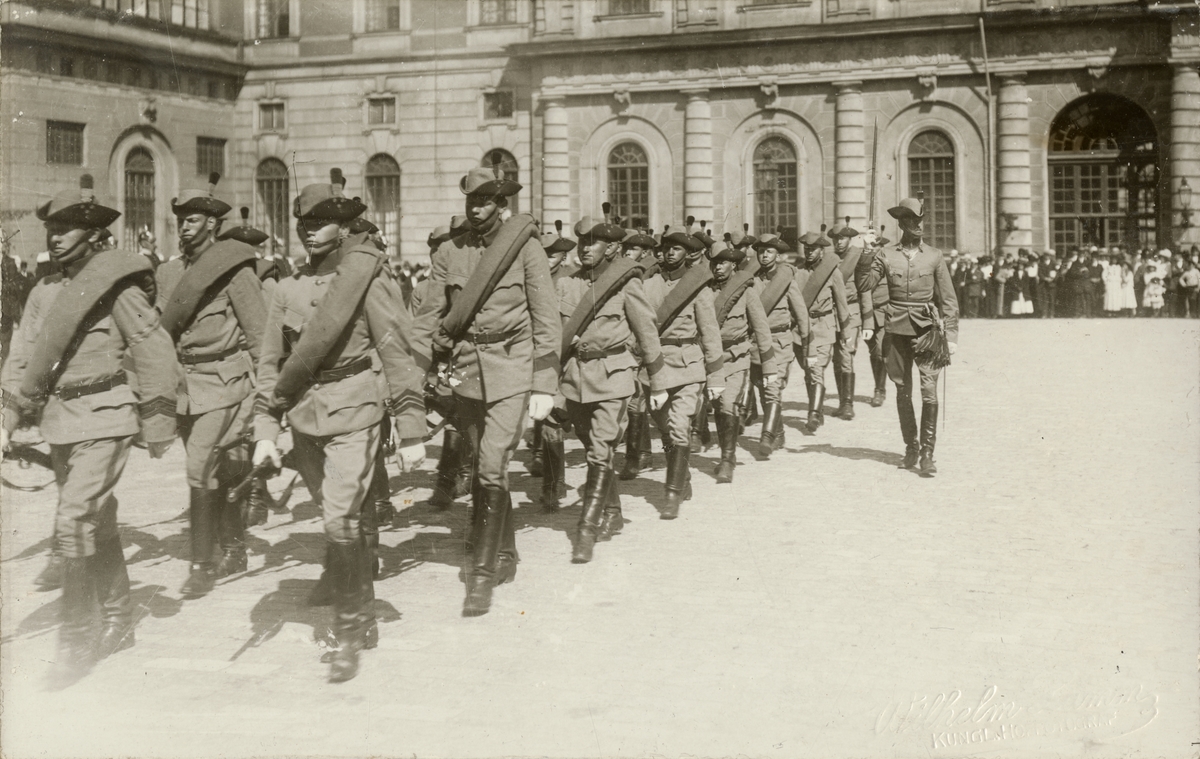 Titel: Text i fotoalbum: Afmarsch från Högvakten. Kungl. Positionsartillerireg.