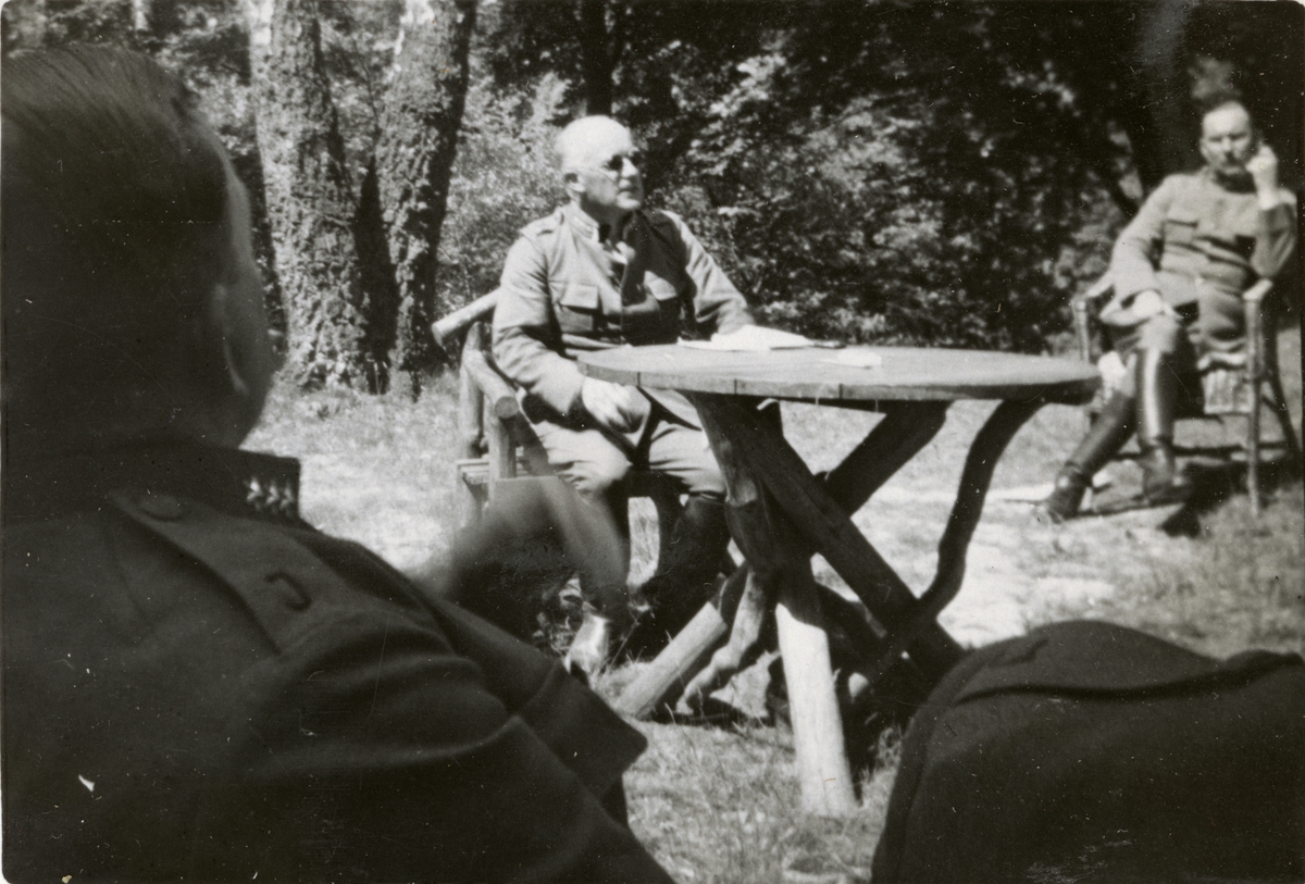 Titel: Text i fotoalbum: "1936 juni. Intendentur-fältövningen i Röstånga. Diskussion i det gröna. Arntz".
