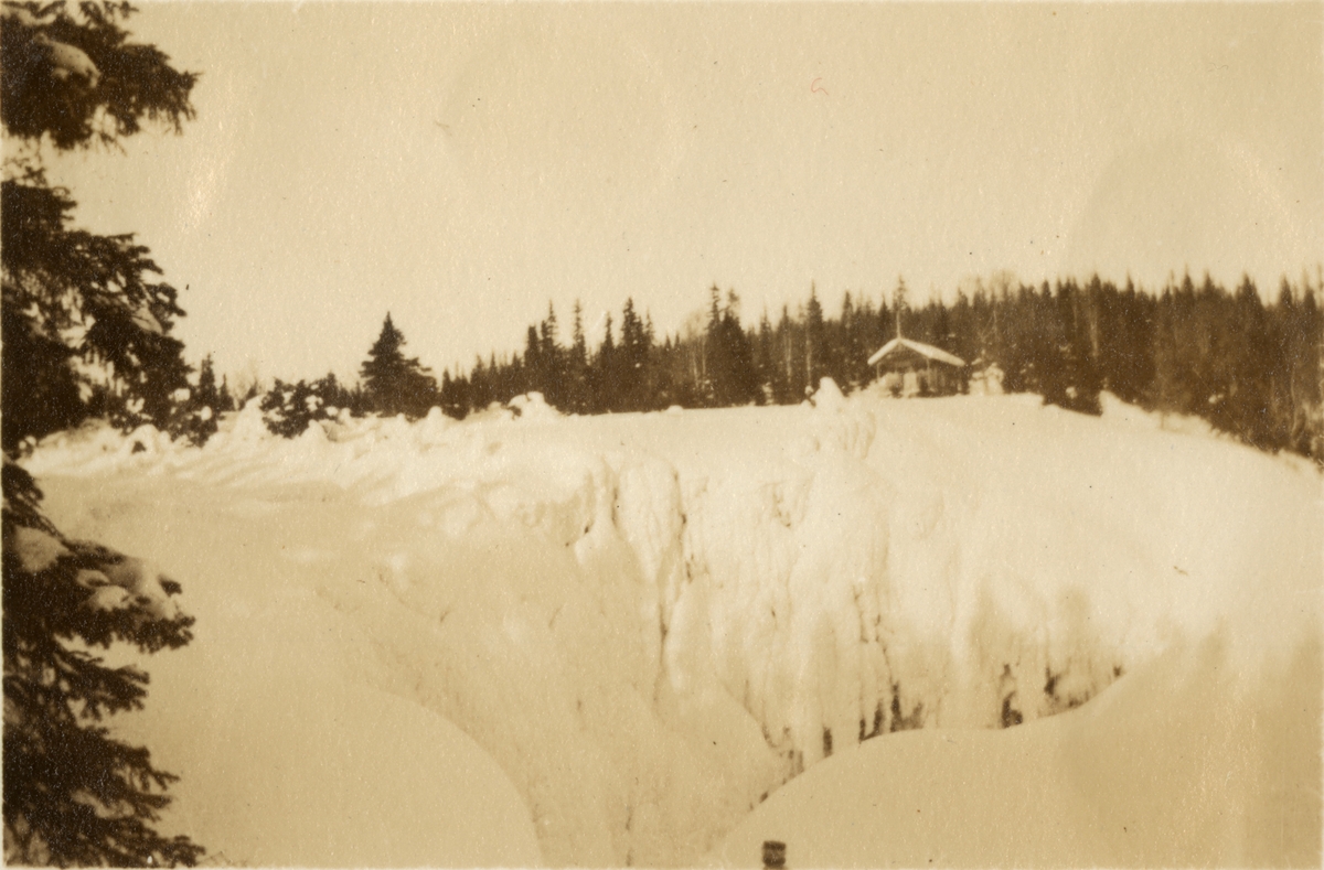 Text i fotoalbum: "Aspirantskolans vinterövningar i Björnänge febr.-mars 1926. En dag tolkade vi till Tännforsen och tillbaka. Tännforsen i vinterskrud".