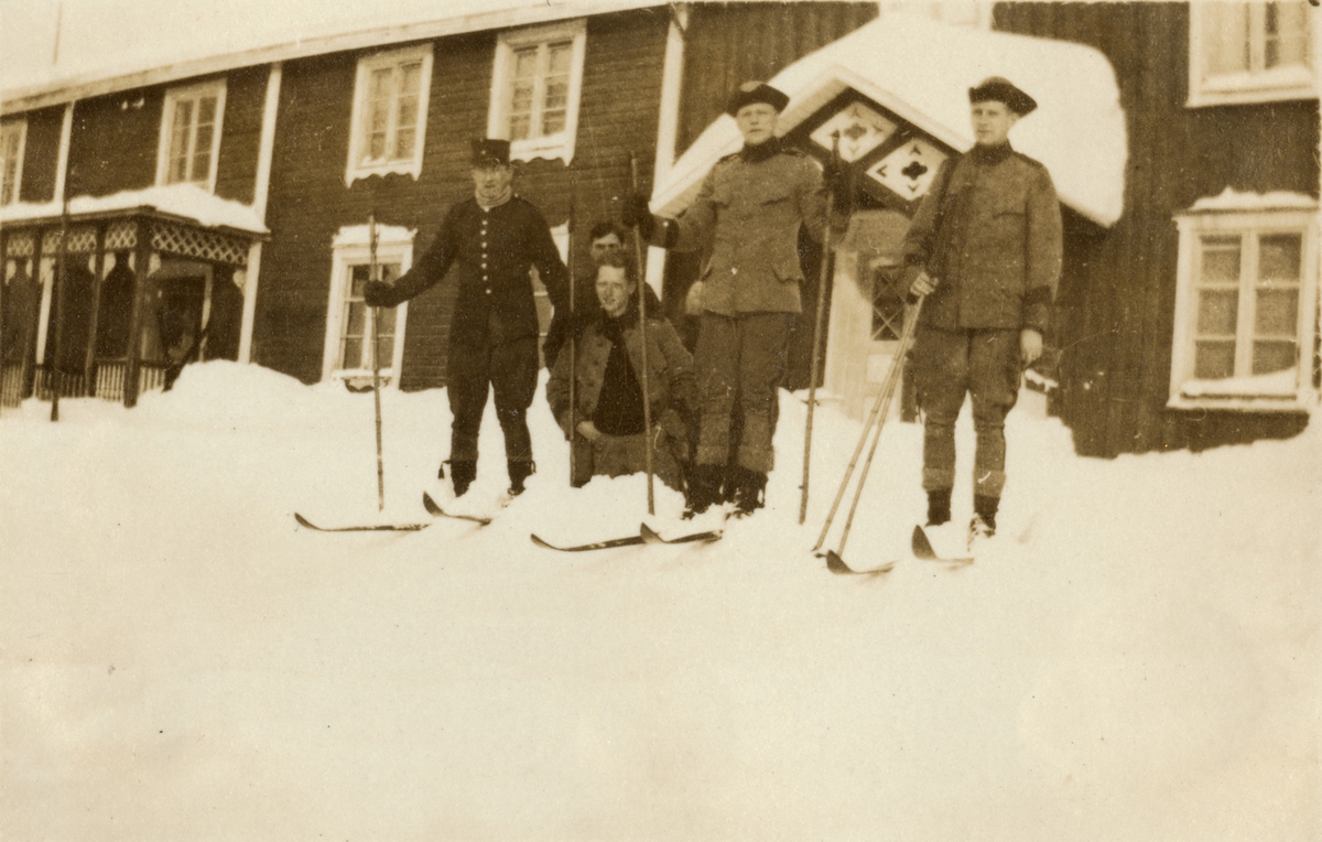 Text i fotoalbum: "Aspirantskolans vinterövningar i Björnänge febr.-mars 1926. "Ledighetskommitten" beskådar backåkningen ".