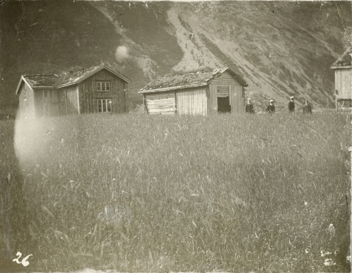 Titel: Bondgård framför en berg.