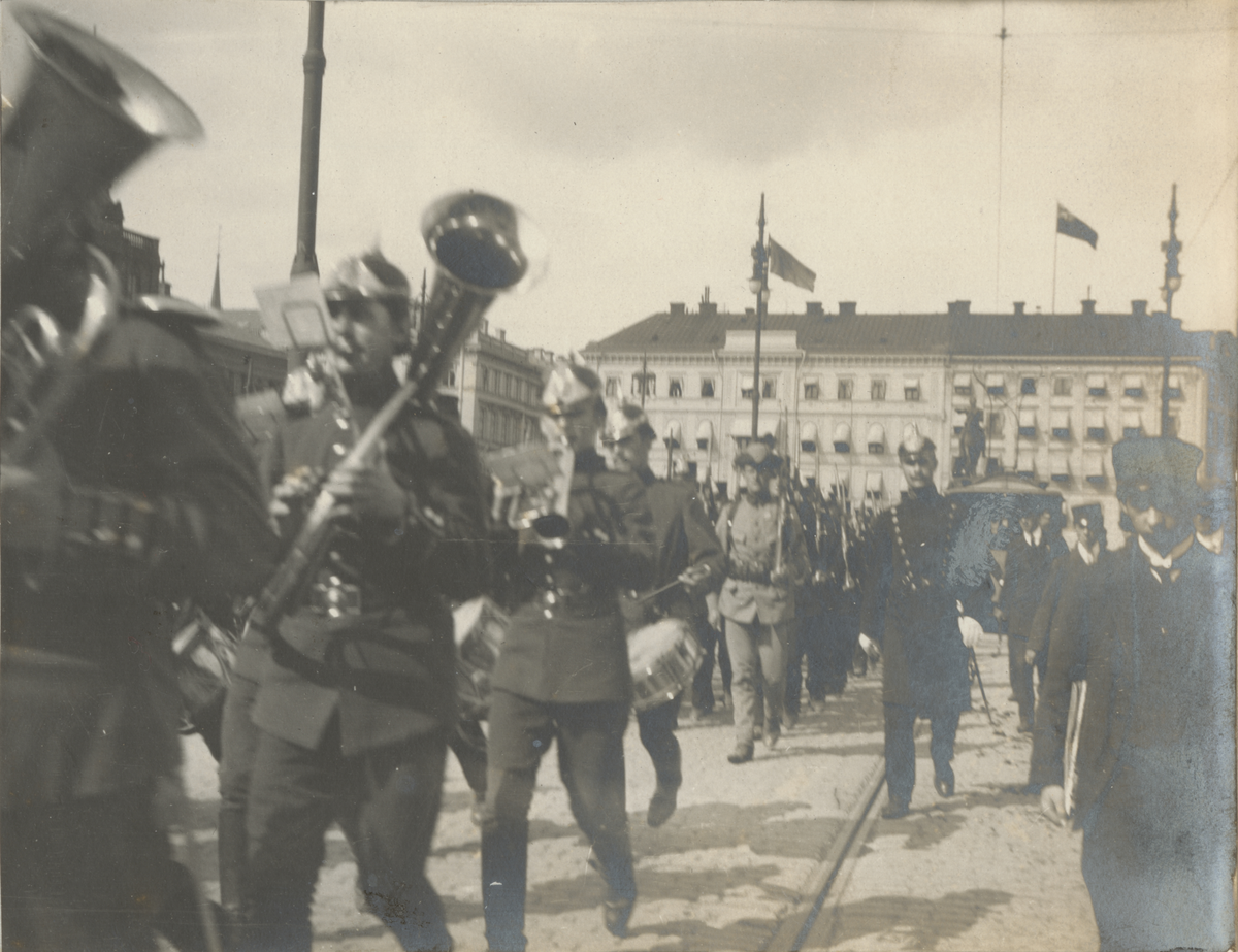 Text i fotoalbum: "Minnen från Storstrejkskommenderingen i Stockholm 1909. Jönköpings rgt:s II. komp. passerar Norrbro. Svea ing.kårs musikkår."