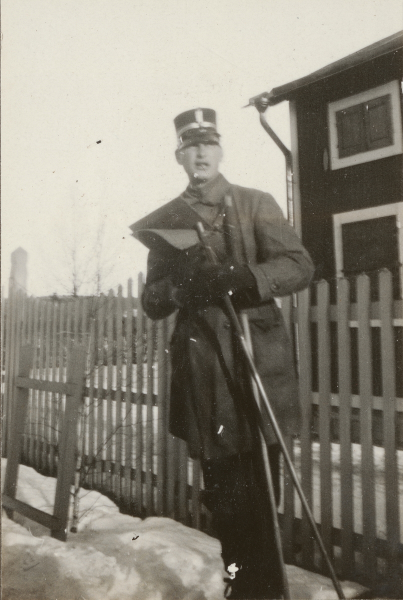 En soldat på skidor läser kartan framför en byggnad. Porträttbild av Christer Wahlgren som deltog i stridsvagnskursen vid Göta livgardes stridsvagnsbataljon år 1928-1930.