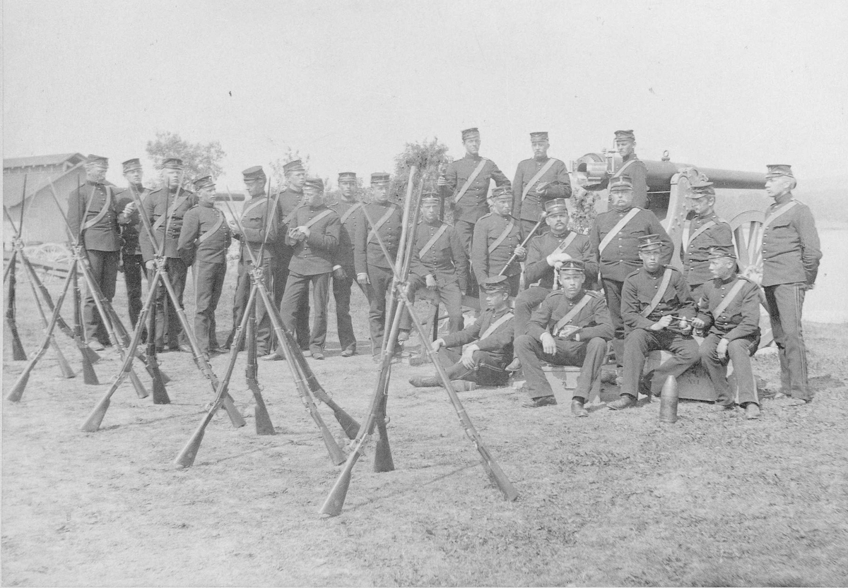 Delar av Vaxholms artillerikår A 5 uppställda framför 12 cm kanon m/1879. I förgrunden gevär m/1867 uppställda i trekantsformationer, 1890-tal.