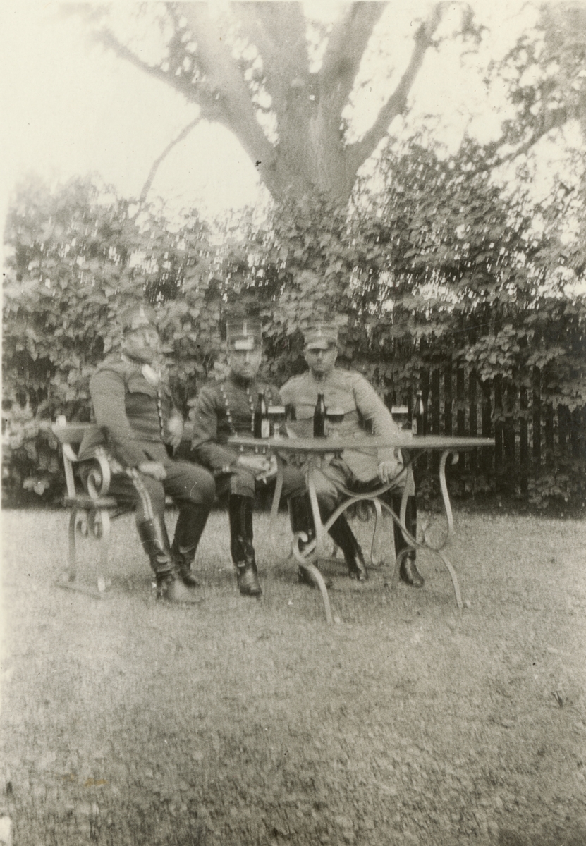Titel: Tre soldater från Positionsartilleriregemente A 9 vid ett trädgårdsbord.