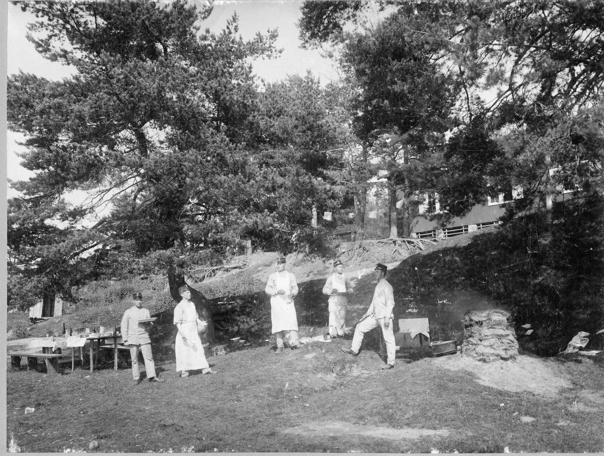 Titel: Kökspersonal ur Hälsinge regemente I 14 dukar mat ute i det fria.
