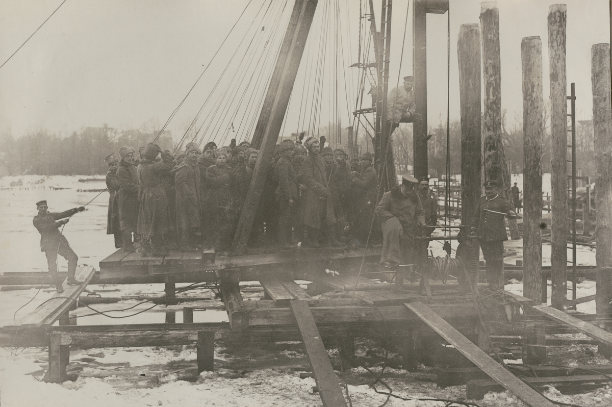 Titel: Text i fotoalbum: "Mitau. Pappritzbrücke öfver Aafloden (idag Lielupe) under byggnad"