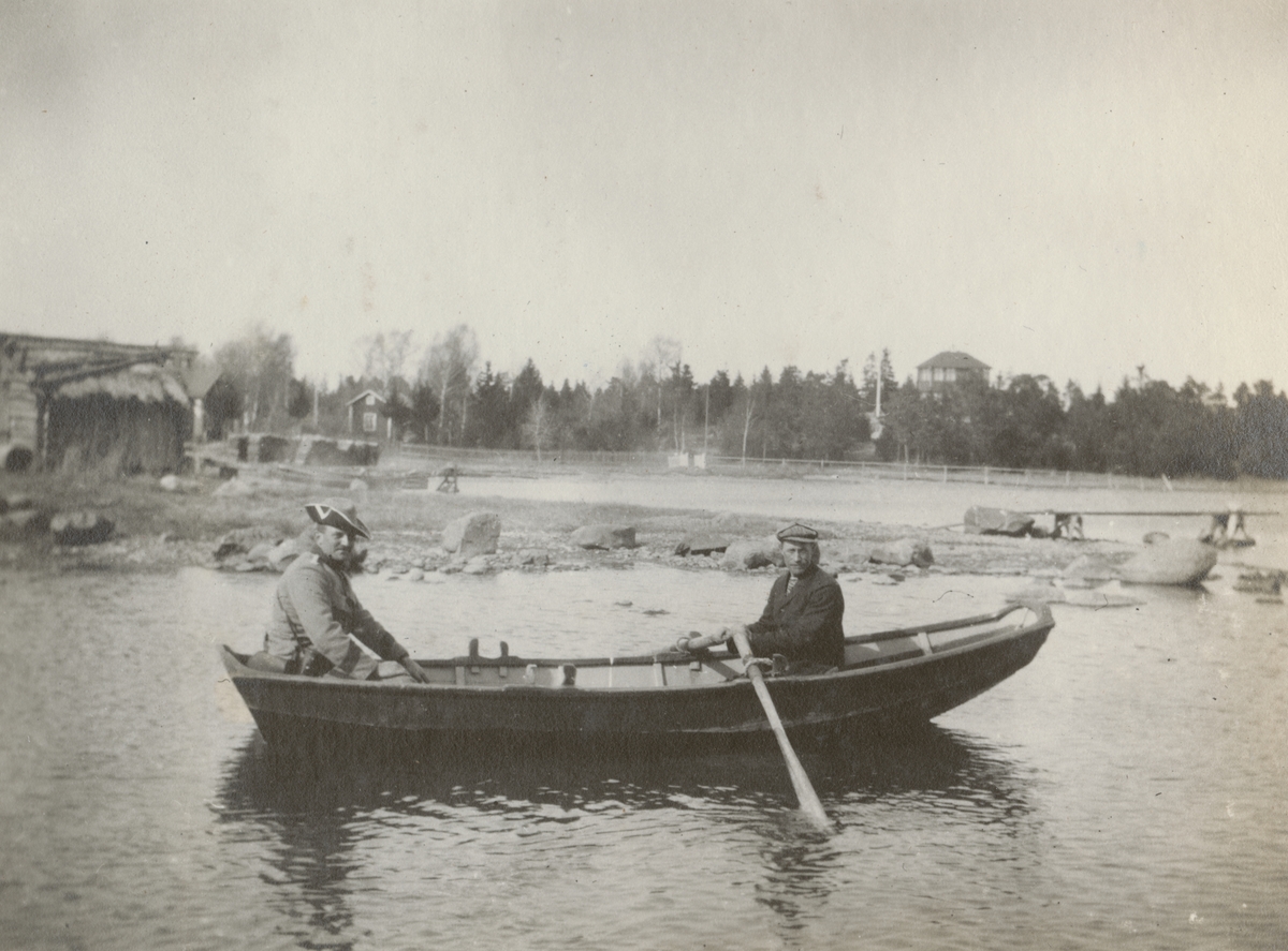 Titel: Två män sitter i en roddbåt. Den civillklädde håller åror och soldaten sitter i akter.