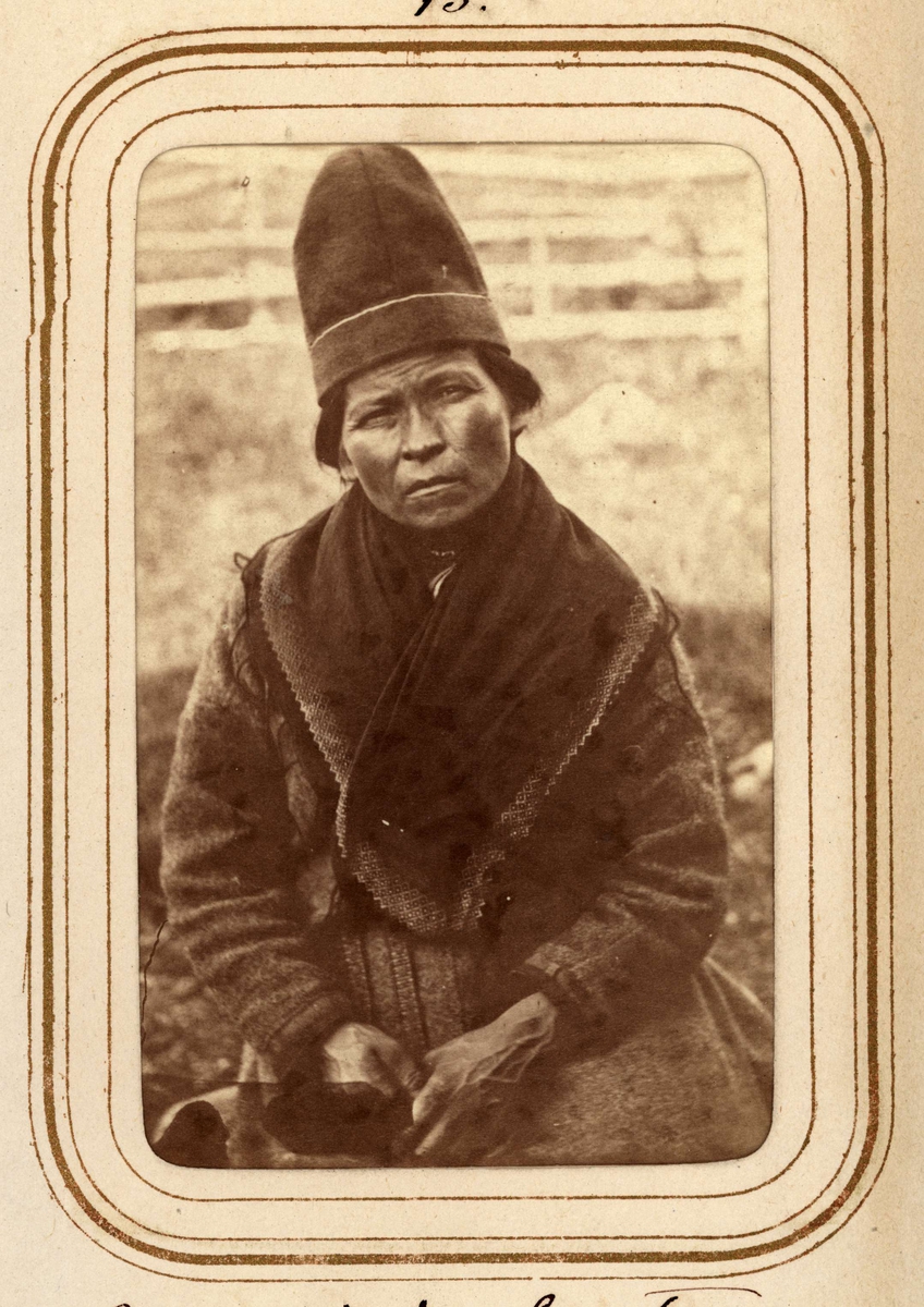 Porträtt av Elsa Nilsdotter Länta, 35 år gammal, Sirkas sameby. Ur Lotten von Dübens fotoalbum med motiv från den etnologiska expedition till Lappland som leddes av hennes make Gustaf von Düben 1868.