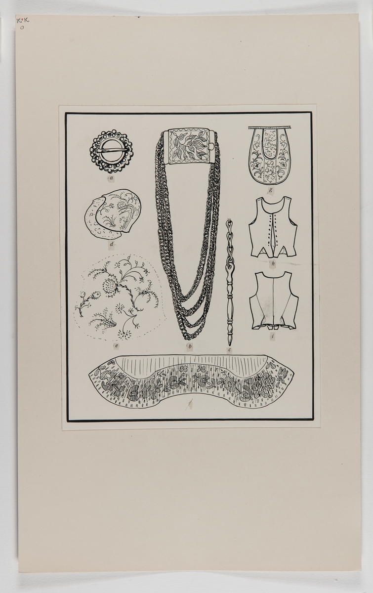 Högtidsdräkt, kvinnodräkt, Gotland. Teckning av Emelie von Walterstorff.