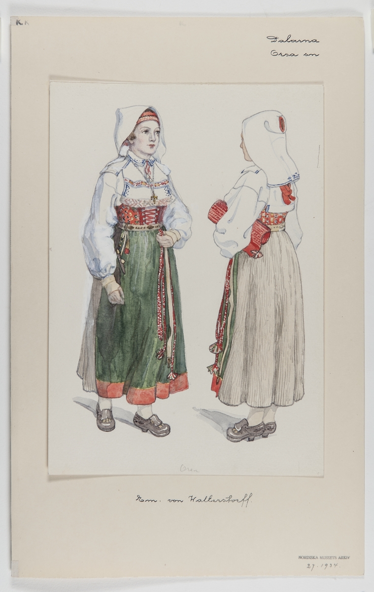 Kvinnodräkt, Orsa socken, Dalarna. Akvarell av Emelie von Walterstorff.