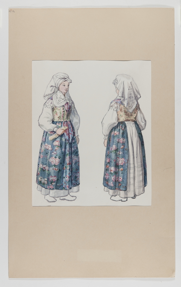 Kvinnodräkt från Jämjö socken i Blekinge. Akvarell av Emelie von Walterstorff.