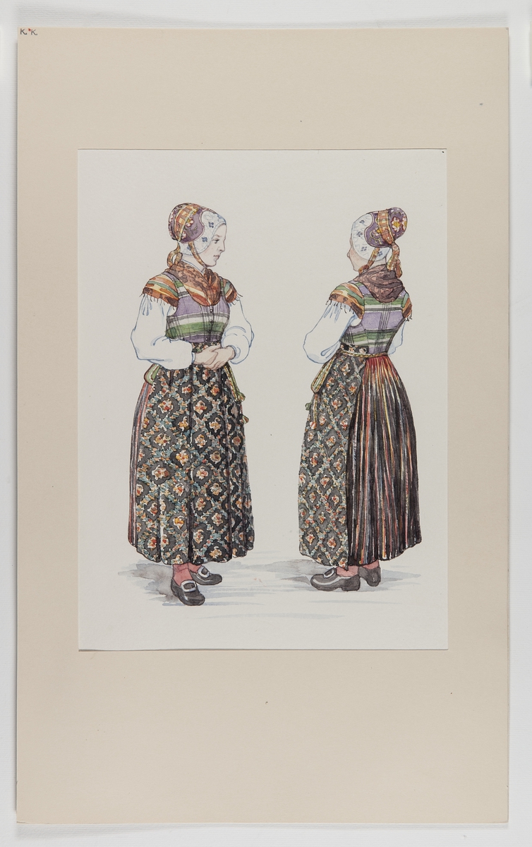 Högtidsdräkt för kvinna. Svärdsjö socken, Dalarna. Akvarell av Emelie von Walterstorff.