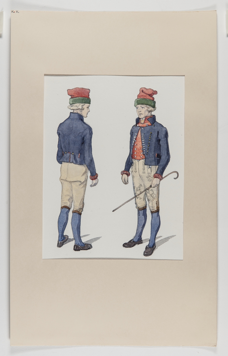 Gillesdräkt för män. Mansdräkt Malungs Socken, Dalarna. Akvarell av Emelie von Walterstorff.