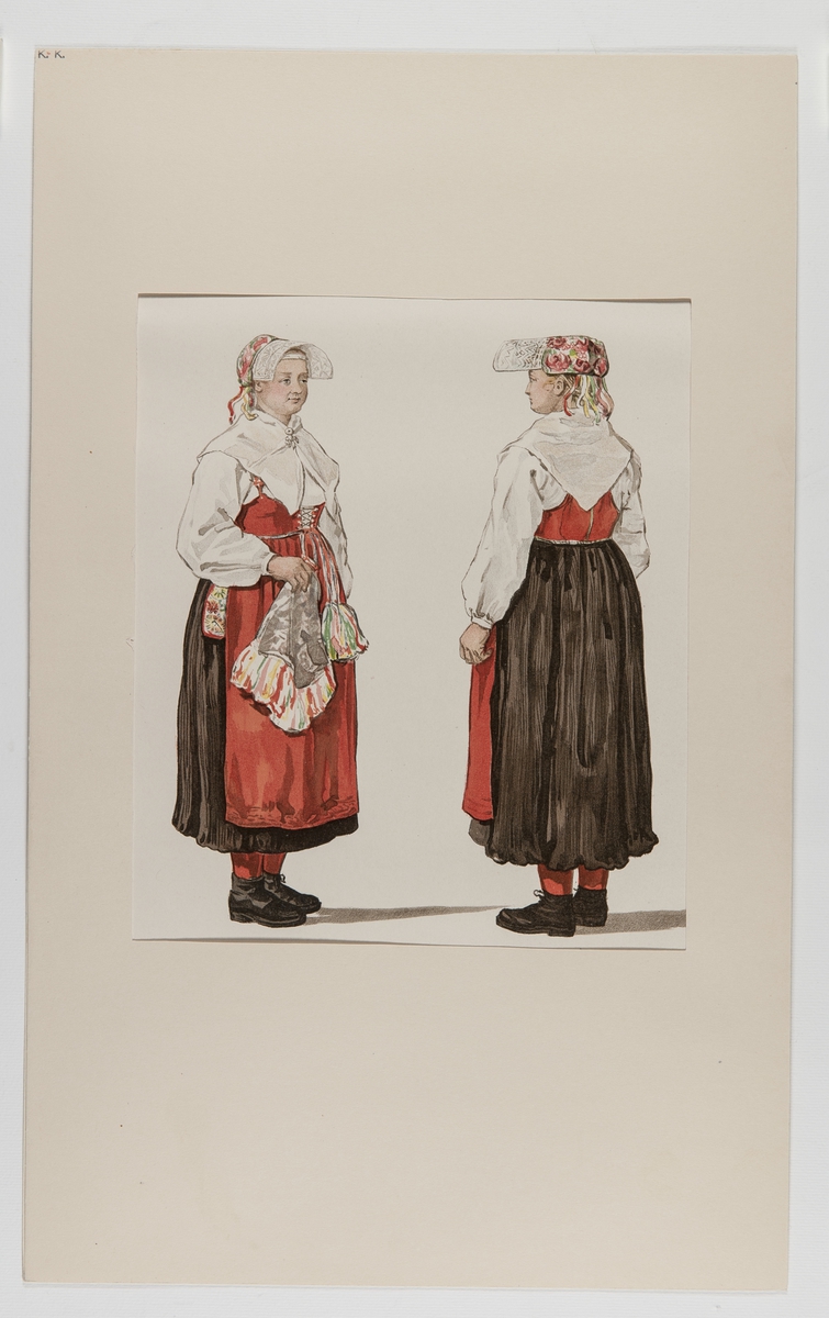 Folkdräkt. Sommardräkt för kvinna. Gagnef socken, Dalarna. Bildtryck efter akvarell av Emelie von Walterstorff. (Sv. Folkdräkter pl. XXII).