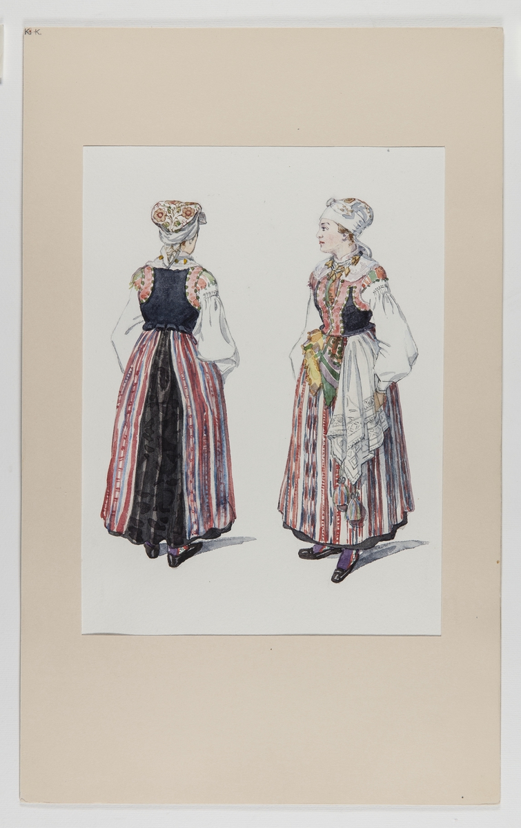 Kvinnodräkt från Östra härad i Blekinge. Akvarell av Emelie von Walterstorff.
