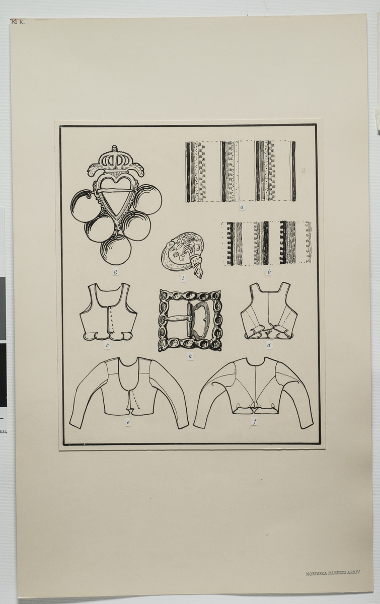 Högtidsdräkt för gift kvinna. Skedevi socken, Finspångaläns härad, Östergötland. Teckning av Emelie von Walterstorff.