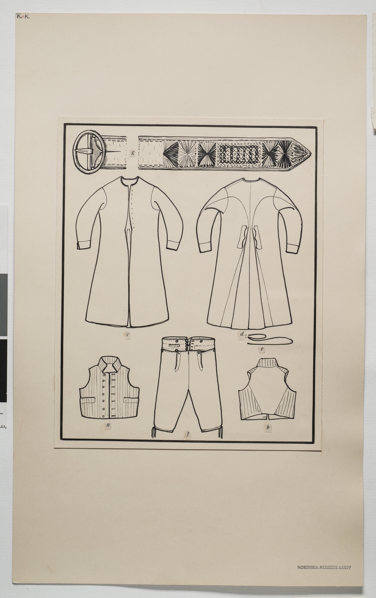 Högtidsdräkt för män Österåker, Oppunda härad, Södermanland. Teckning av Emelie von Walterstorff.