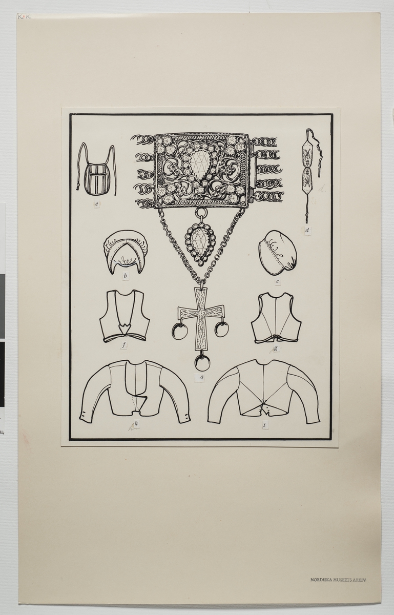 Festdräkt Sonnerbo härad, Småland. Teckning av Emelie von Walterstorff.